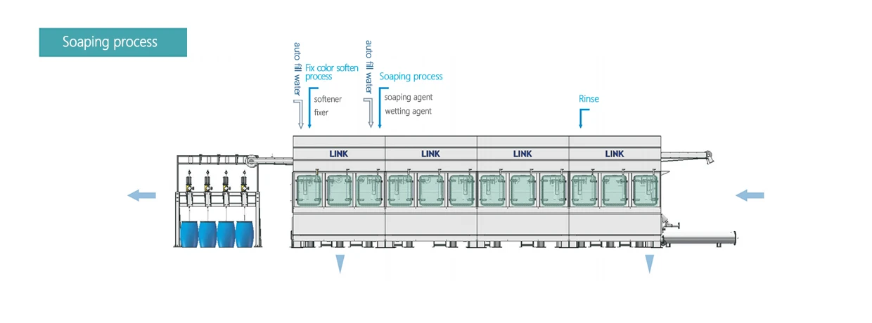 After dyeing washing: reactive soap washing, acid fix color washing, disperse reduction washing, yarn dyed washing