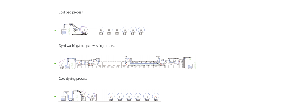 It is suitable for cold pad dyeing of knitted fabrics. The dyeing process don't need steam or salt. Compared with traditional VAT dyeing process, energy consumption is lower and COD emission is reduced. Cold dyeing process flexible operation, one machine has more function, such as cold bleaching, alkaline shrinkage process and other applications.